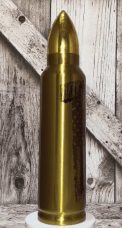 Sans bold print, this 35oz stainless-steel leak-proof bullet tumbler still makes a statement. It is double wall vacuum insulated, keeping your drinks hot or cold for hours. Standing at 14.3" tall and 3.27" wide, this durable bullet still booms badass.